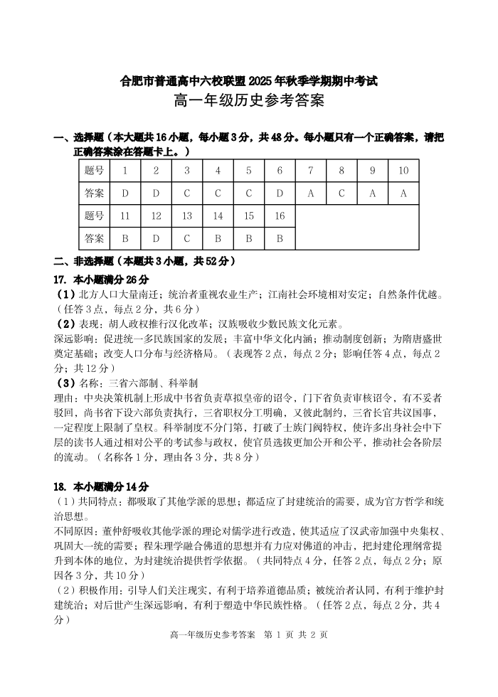 合肥市普通高中六校联盟2025年秋季学期高一年级期中考试 历史答案.pdf