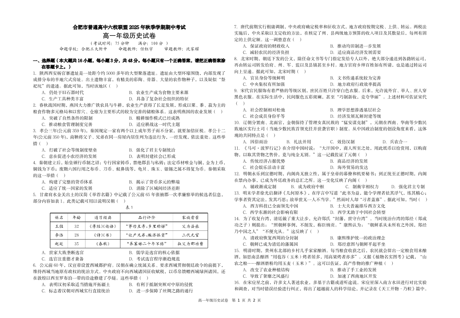 合肥市普通高中六校联盟2025年秋季学期高一年级期中考试 历史.pdf