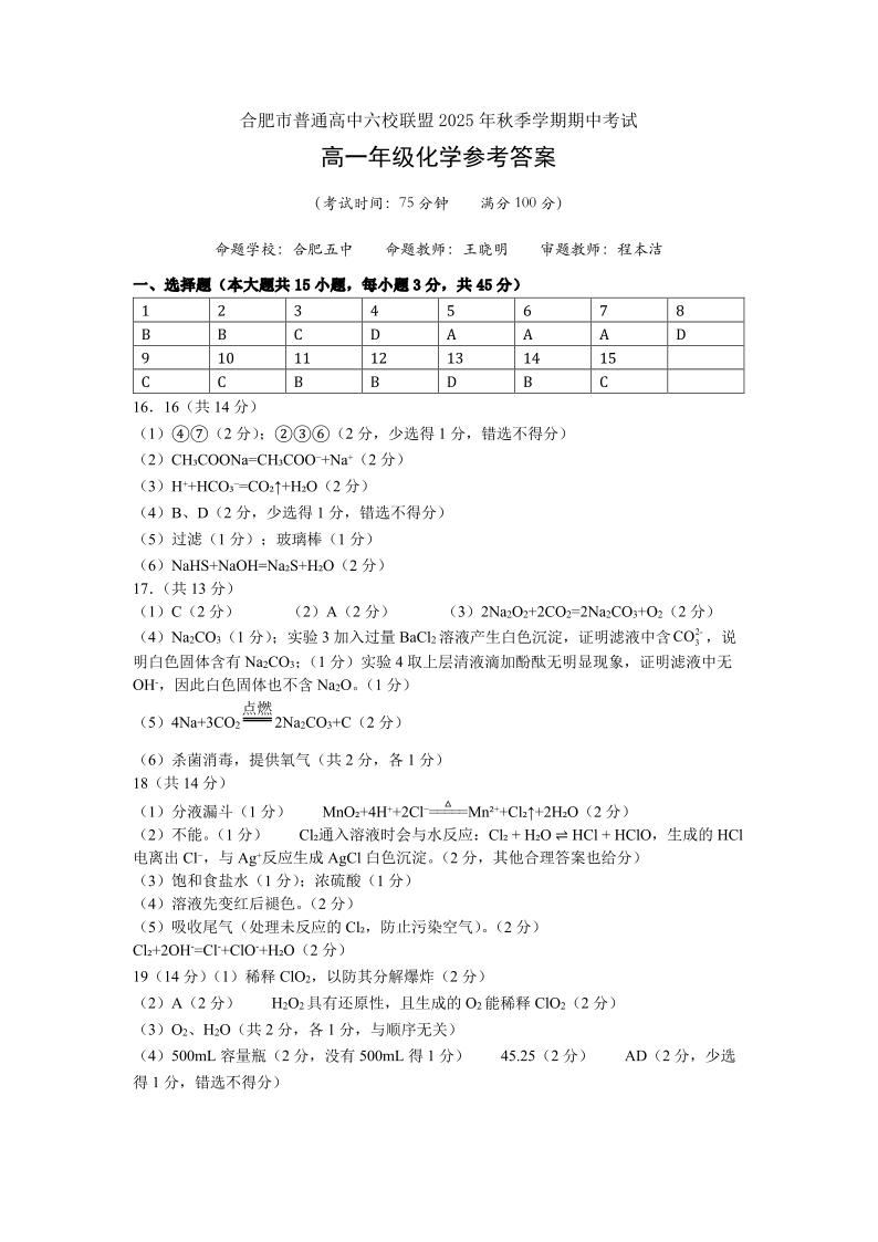 合肥市普通高中六校联盟2025年秋季学期高一年级期中考试 化学答案.pdf