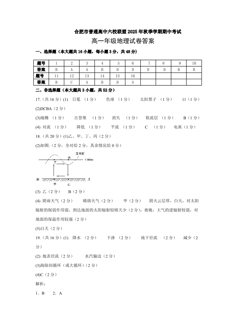 合肥市普通高中六校联盟2025年秋季学期高一年级期中考试 地理答案.pdf