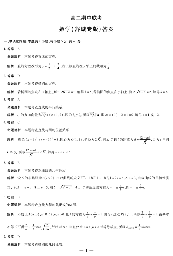 【数学舒城专版答案】天一大联考·安徽省2025-2026学年高二上学期期中联考.pdf