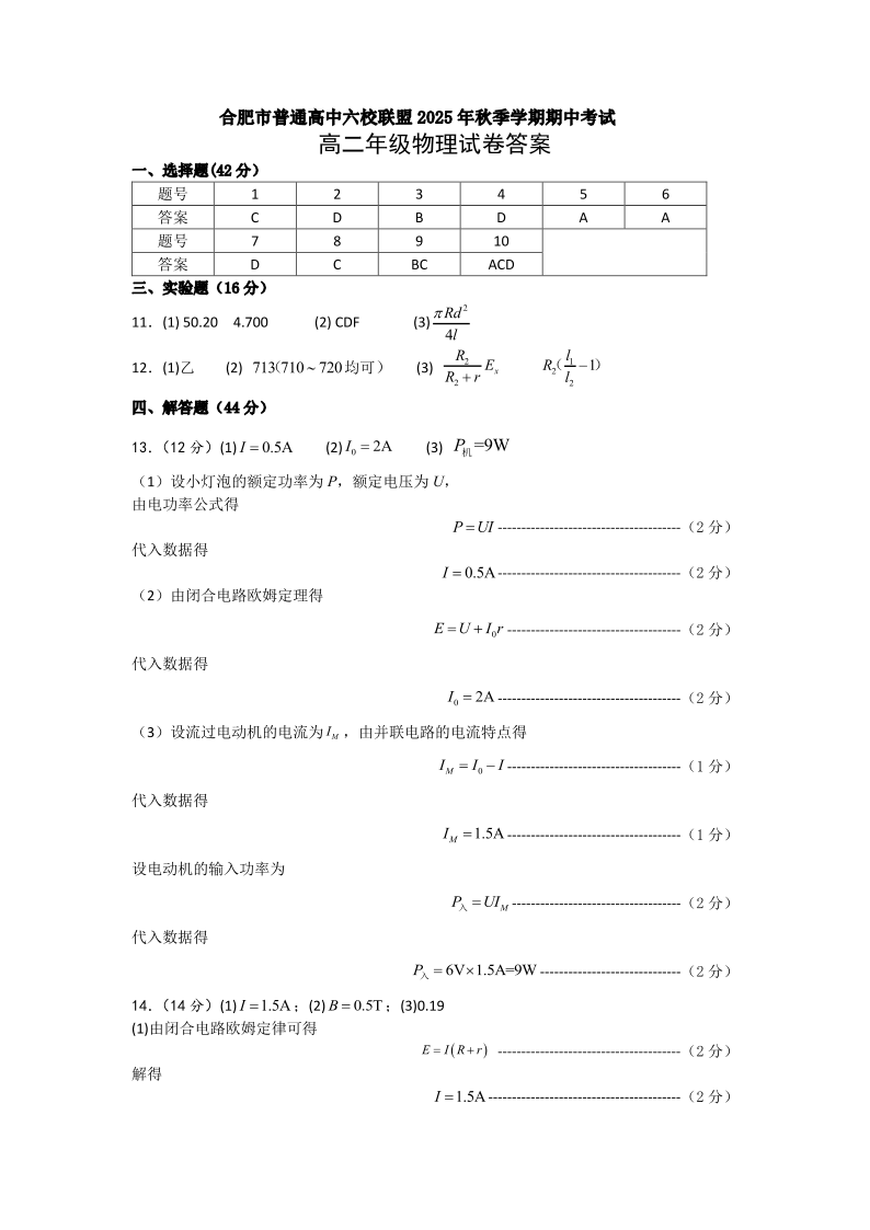 合肥市普通高中六校联盟2025年秋季学期高二年级期中考试 物理答案.pdf