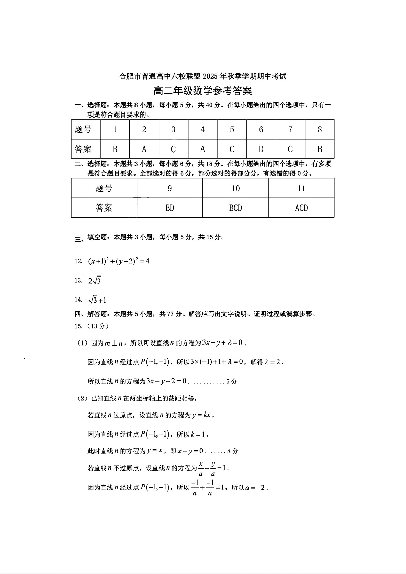 合肥市普通高中六校联盟2025年秋季学期高二年级期中考试 数学答案.pdf