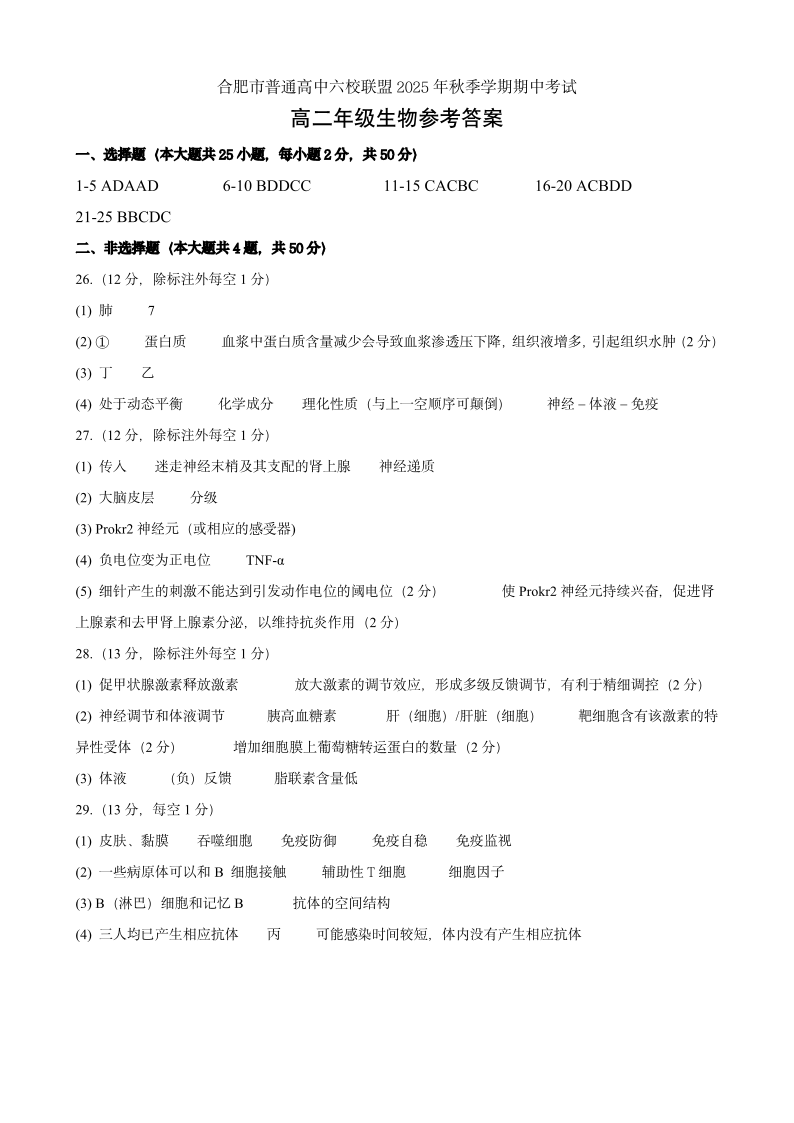 合肥市普通高中六校联盟2025年秋季学期高二年级期中考试 生物答案.pdf
