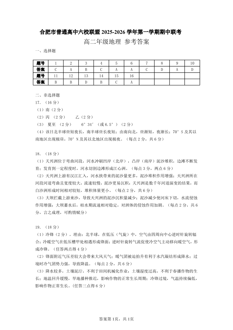 合肥市普通高中六校联盟2025年秋季学期高二年级期中考试 地理答案.pdf