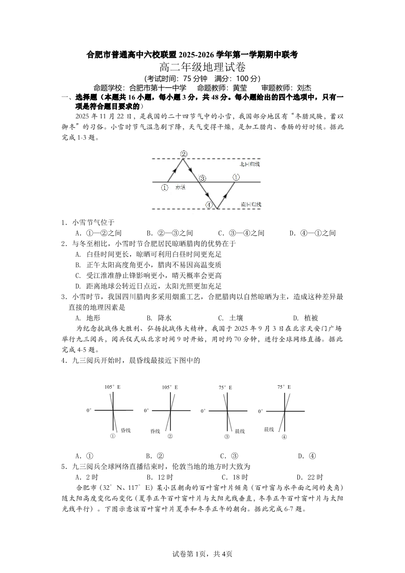 合肥市普通高中六校联盟2025年秋季学期高二年级期中考试 地理.pdf