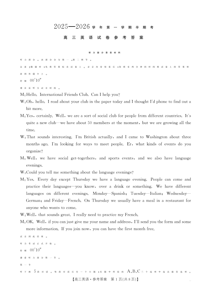 福建省2025-2026学年第一学期半期考 英语答案.pdf