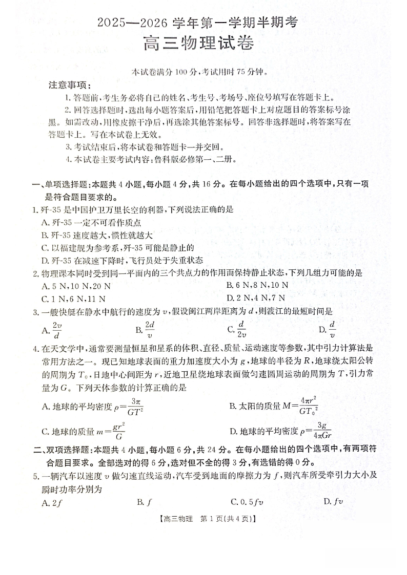 福建省2025-2026学年第一学期半期考 物理.pdf