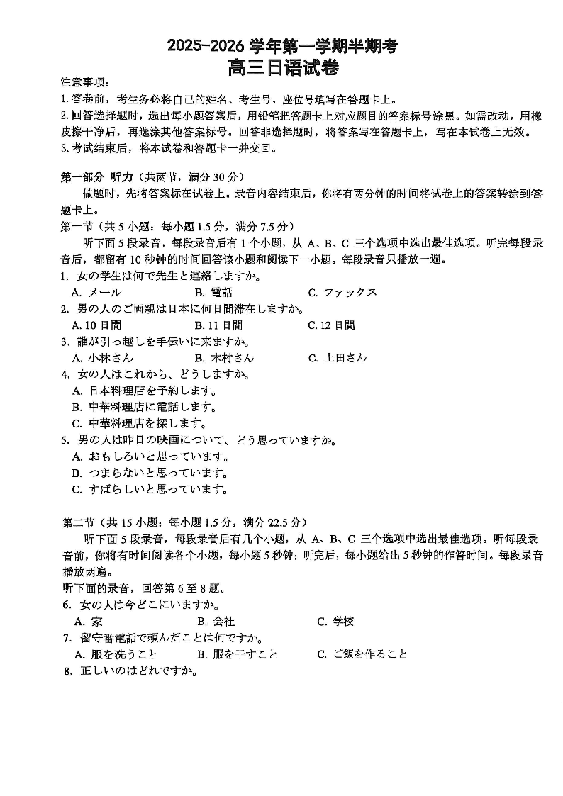 福建省2025-2026学年第一学期半期考 日语.pdf