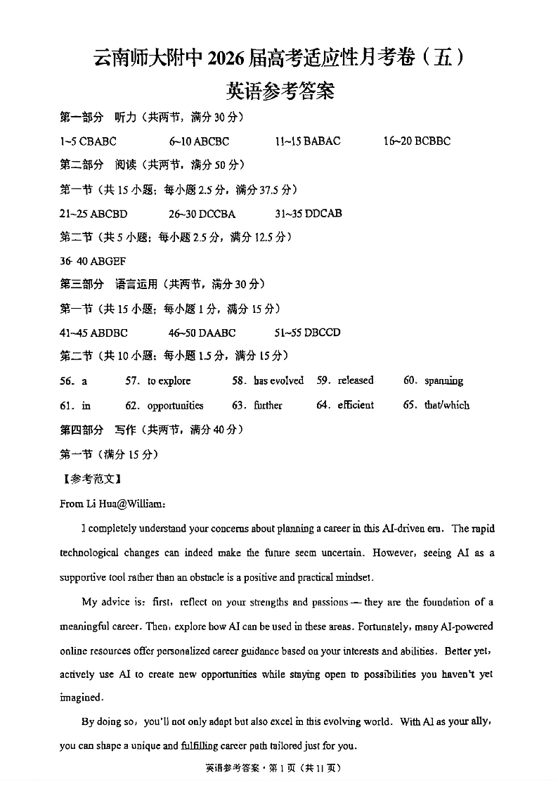 云南师大附中2026届高考适应性月考卷(五)英语答案.pdf