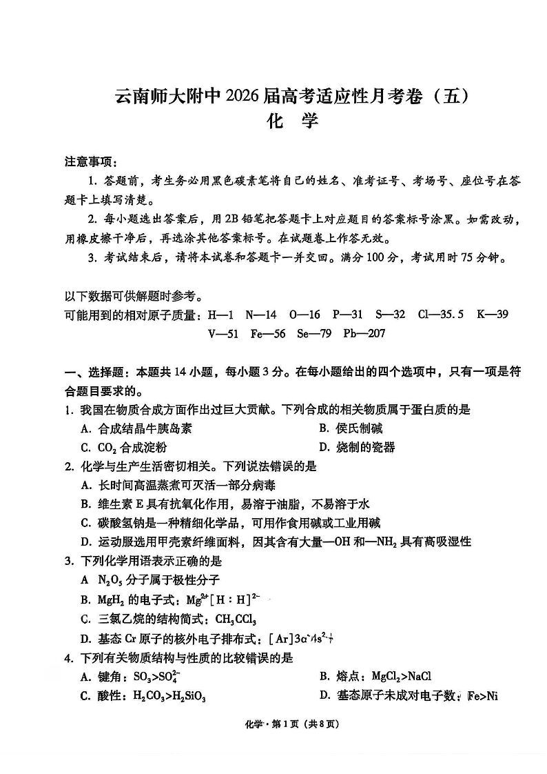 云南师大附中2026届高考适应性月考卷(五)化学.pdf