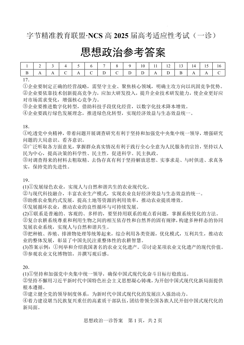 字节精准教育联盟·NCS高2026届高考适应性考试(一诊)政治答案.pdf
