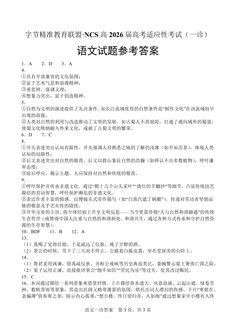 字节精准教育联盟·NCS高2026届高考适应性考试(一诊)语文答案.pdf