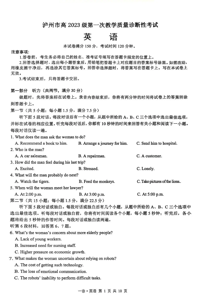 泸州市高2023级第一次教学质量诊断性考试 英语.pdf