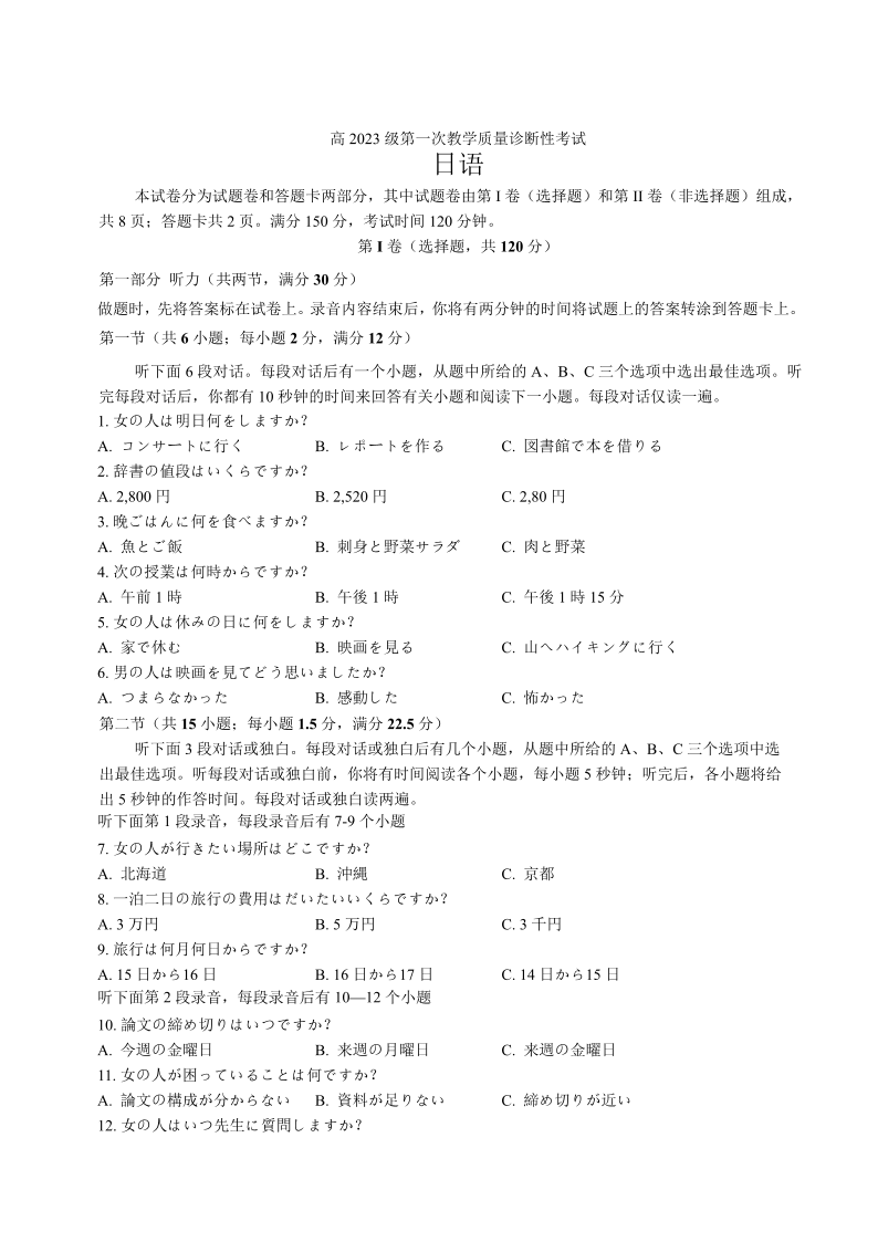 泸州市高2023级第一次教学质量诊断性考试 日语.pdf
