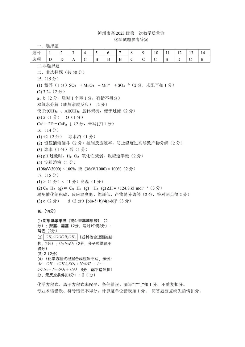 泸州市高2023级第一次教学质量诊断性考试 化学答案.pdf