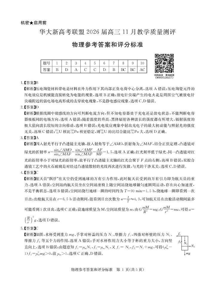 华大新高考联盟2026届高三11月教学质量测评 物理答案.pdf