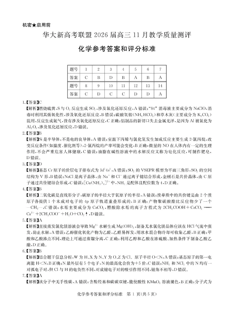 华大新高考联盟2026届高三11月教学质量测评 化学答案.pdf