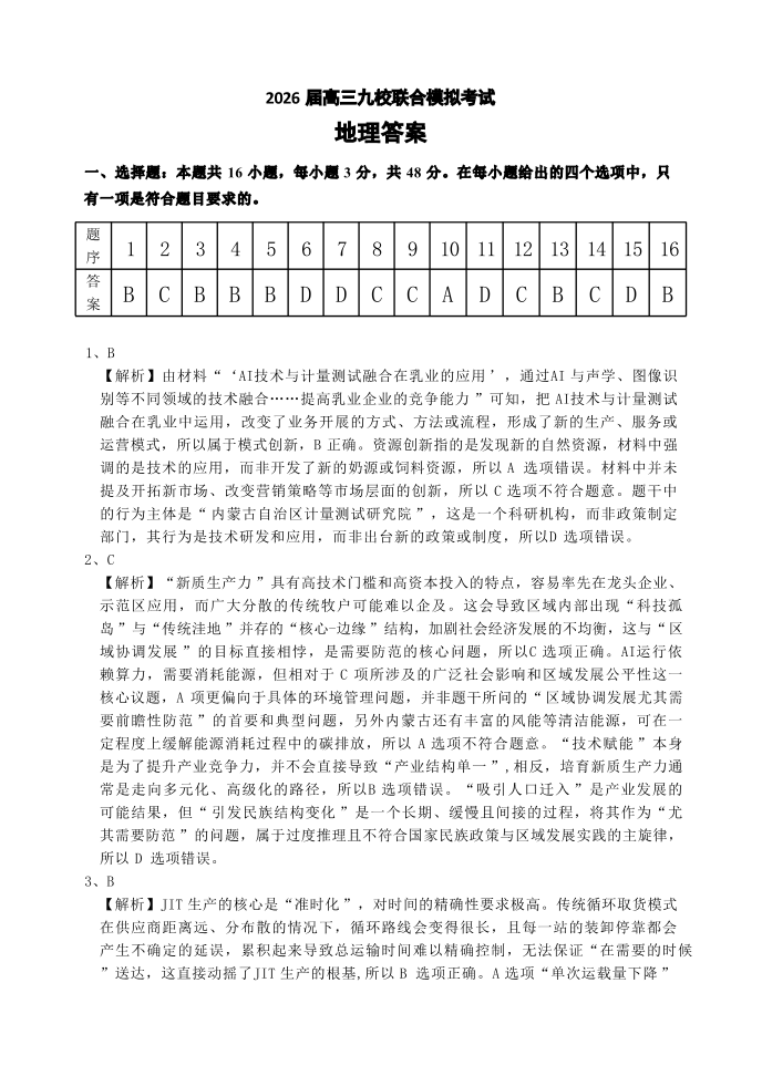 吉林省2026届高三九校联合模拟考试 地理答案.pdf