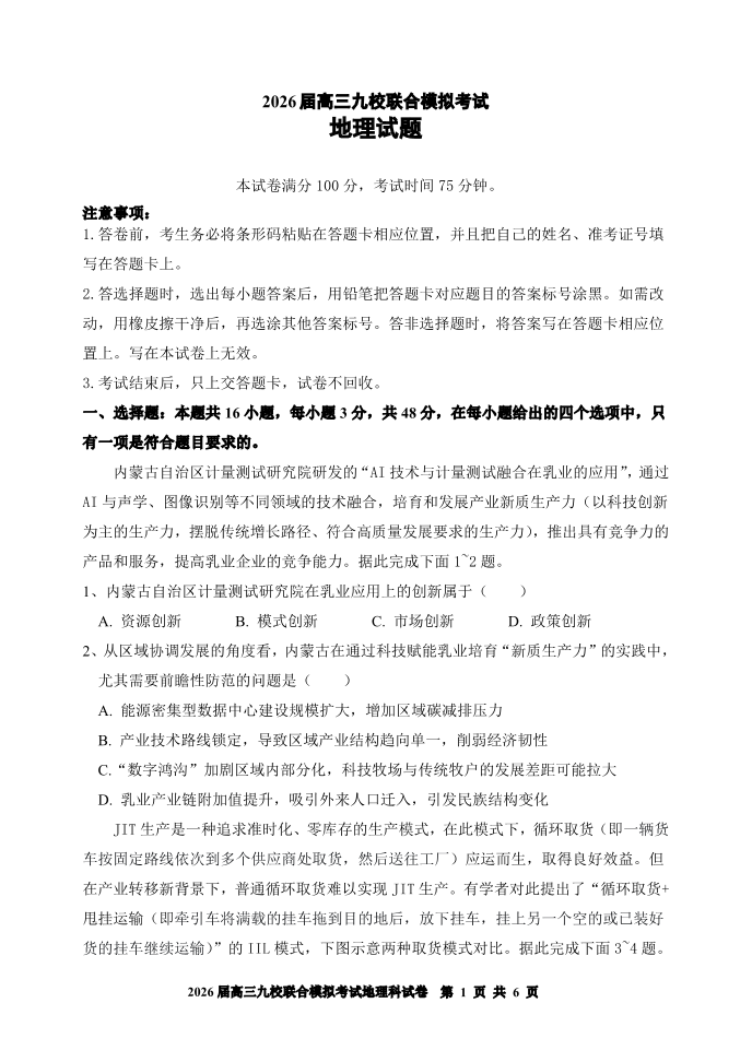 吉林省2026届高三九校联合模拟考试 地理.pdf