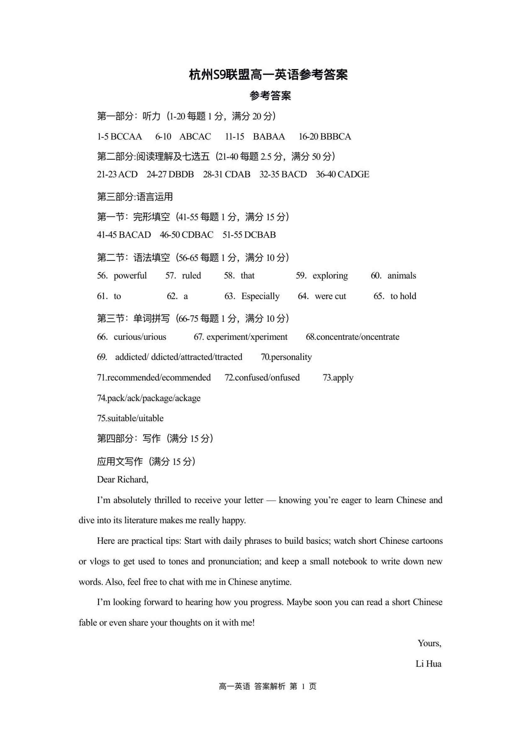 浙江省S9联盟2025-2026学年高一上学期11月期中考试 英语答案.pdf