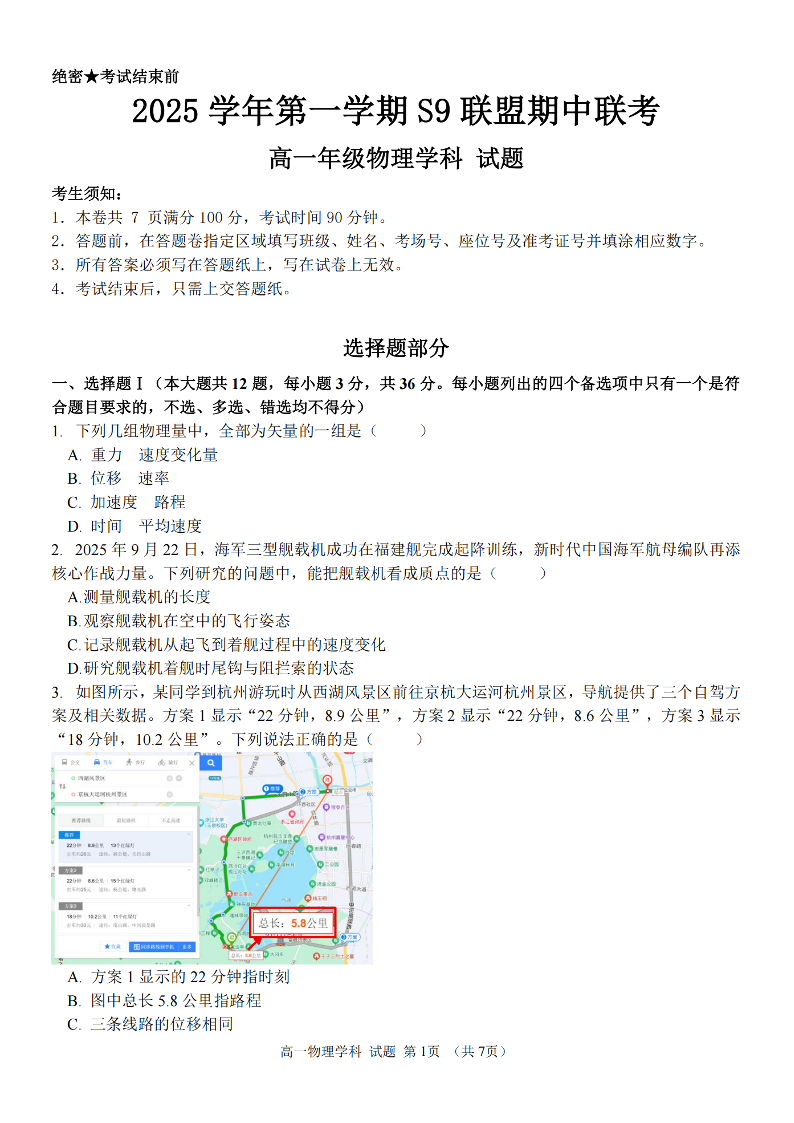 浙江省S9联盟2025-2026学年高一上学期11月期中考试 物理试题(含答案).pdf