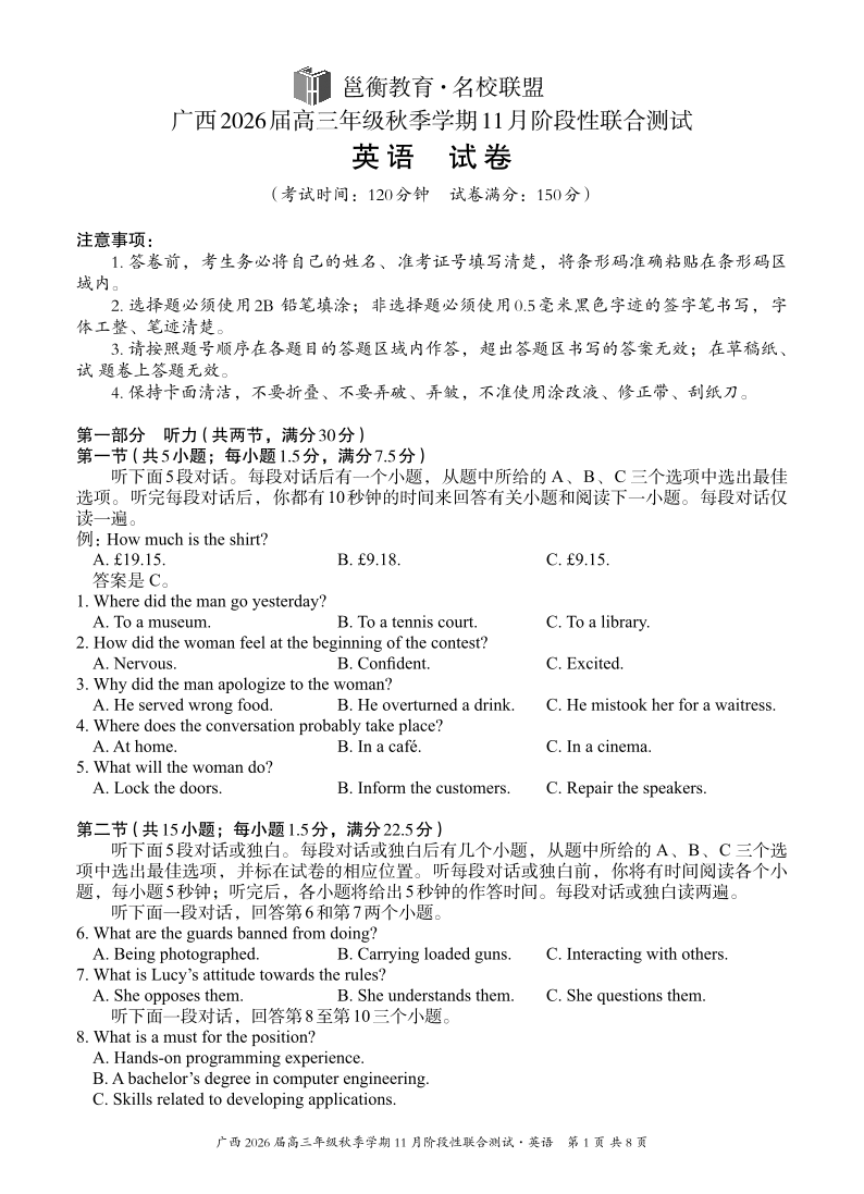广西2026届高三年级秋季学期11月份阶段性联合测试 英语.pdf