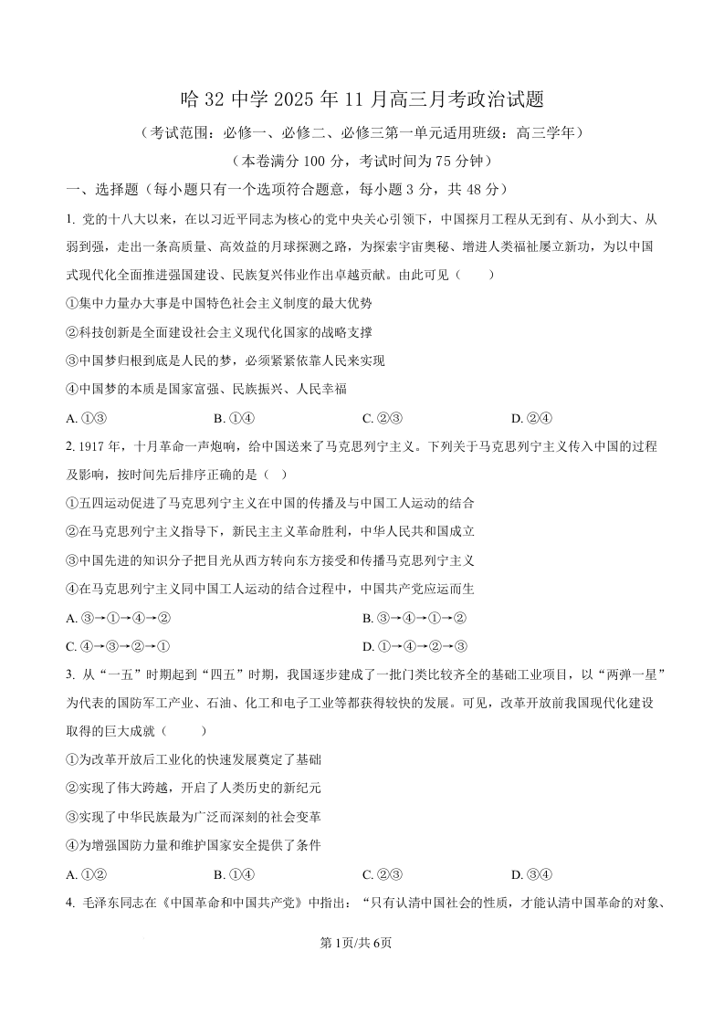 黑龙江省哈尔滨市第三十二中学校2026届高三上学期11月期中考试 政治.docx