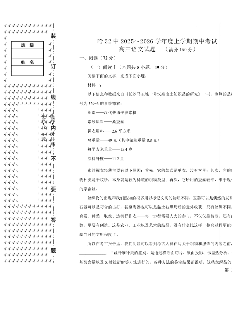 黑龙江省哈尔滨市第三十二中学校2026届高三上学期11月期中考试 语文试题(含答案).docx