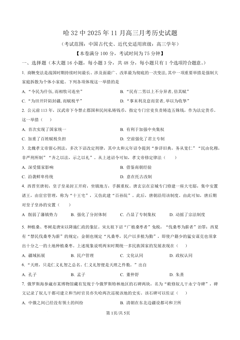 黑龙江省哈尔滨市第三十二中学校2026届高三上学期11月期中考试 历史.docx