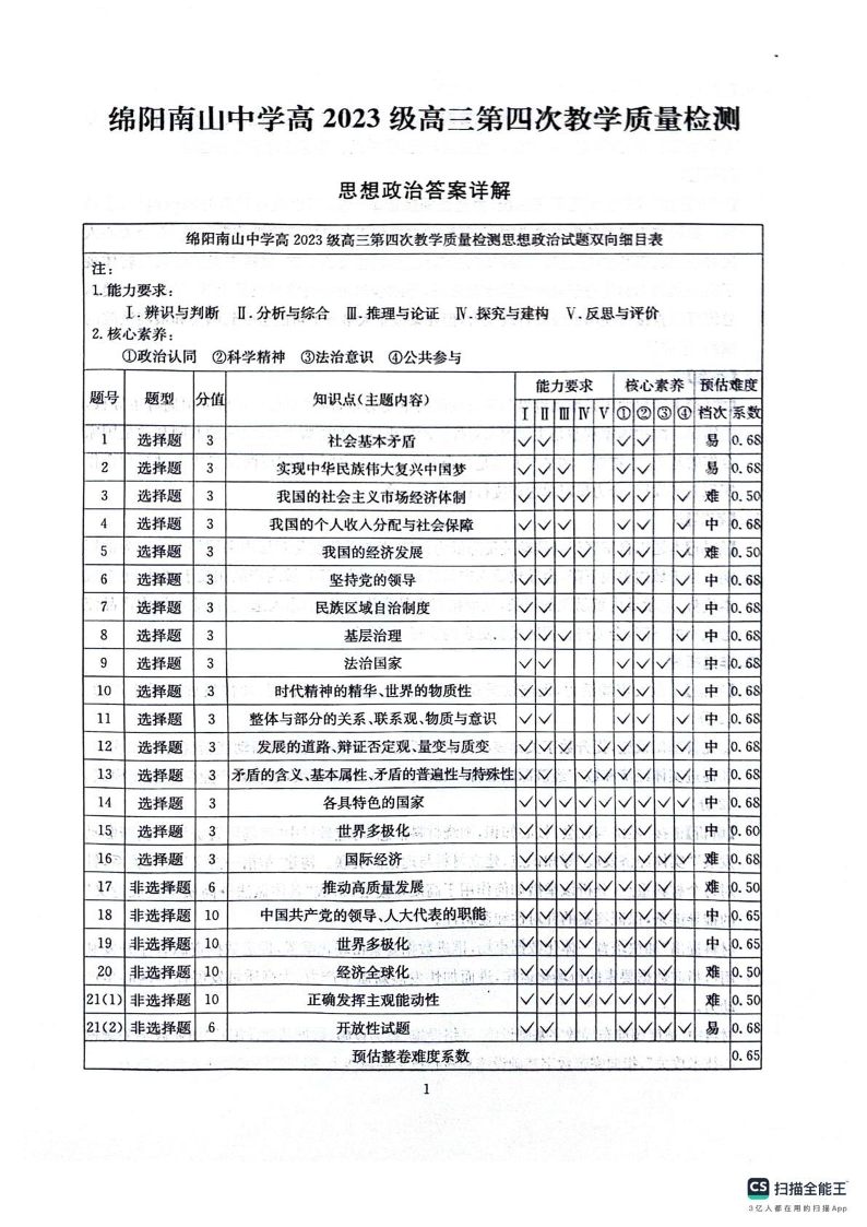 绵阳南山中学高2023级高三第四次教学质量检测 政治答案.pdf