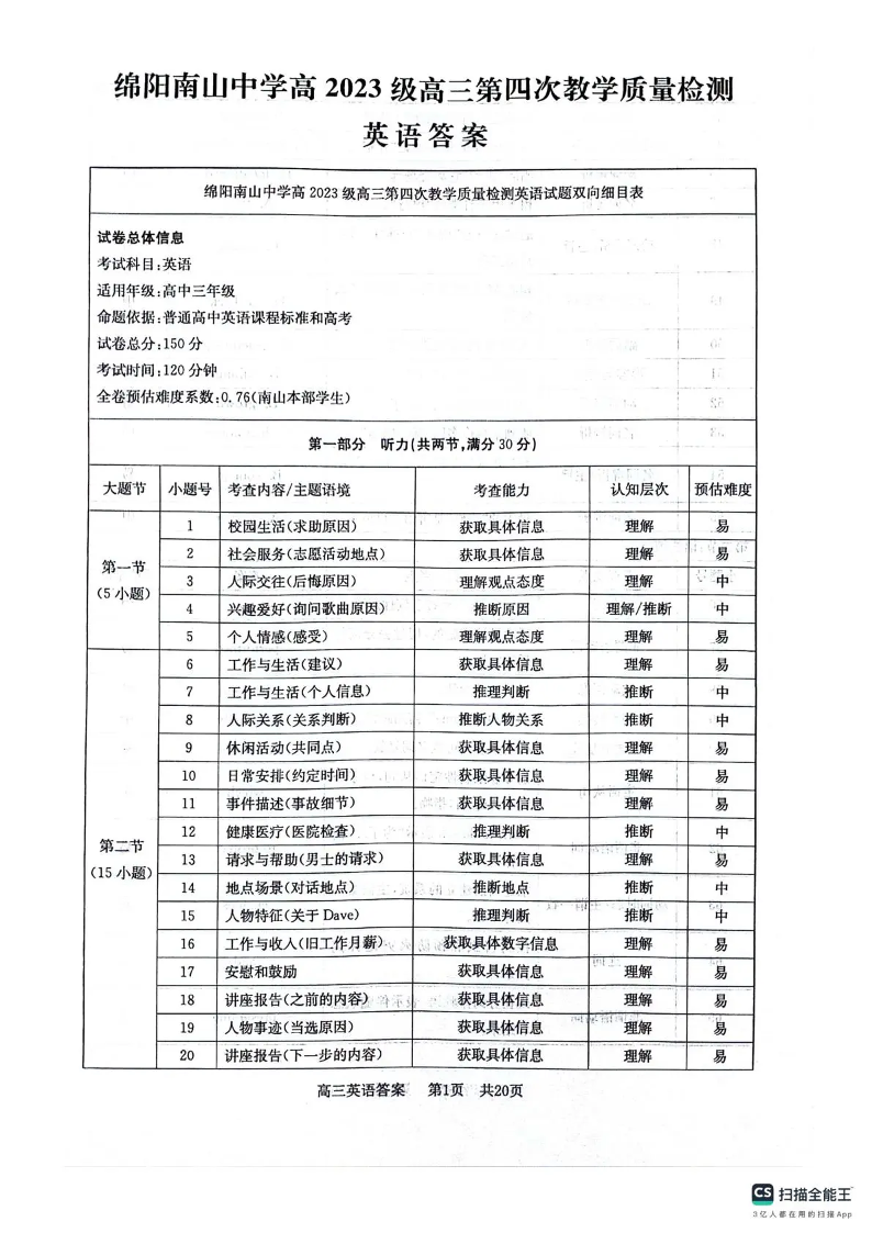 绵阳南山中学高2023级高三第四次教学质量检测 英语答案.pdf