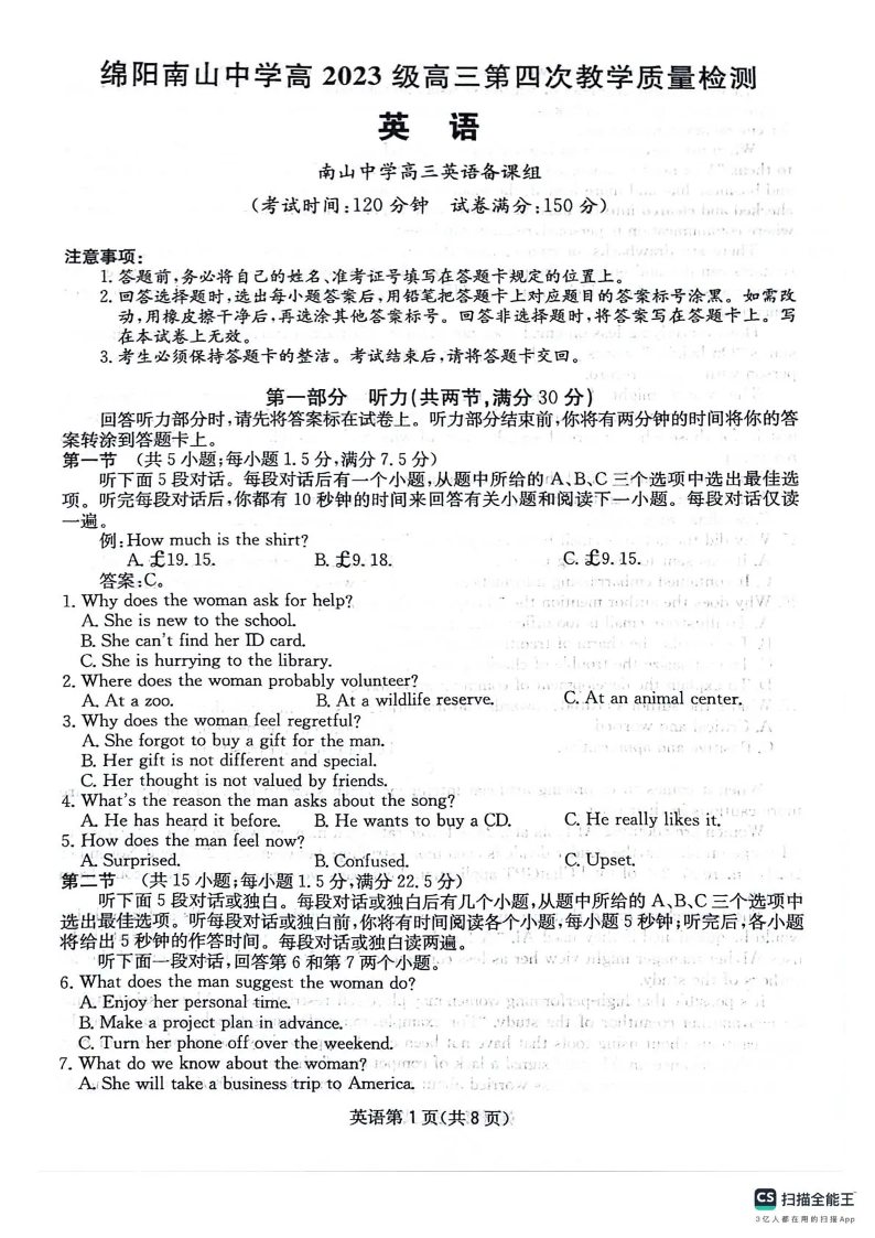 绵阳南山中学高2023级高三第四次教学质量检测 英语.pdf