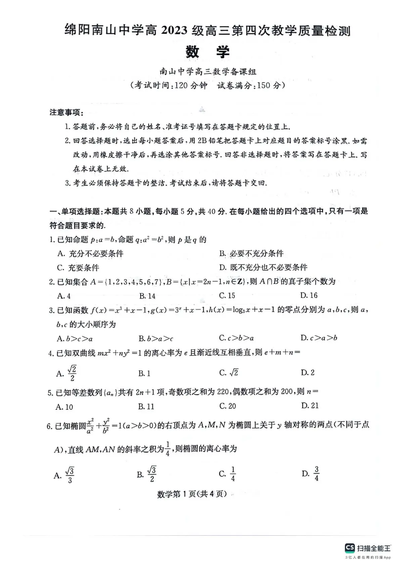 绵阳南山中学高2023级高三第四次教学质量检测 数学.pdf