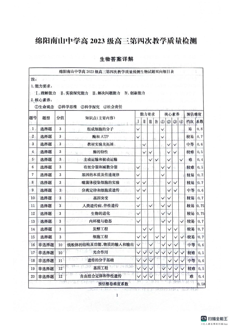 绵阳南山中学高2023级高三第四次教学质量检测 生物答案.pdf