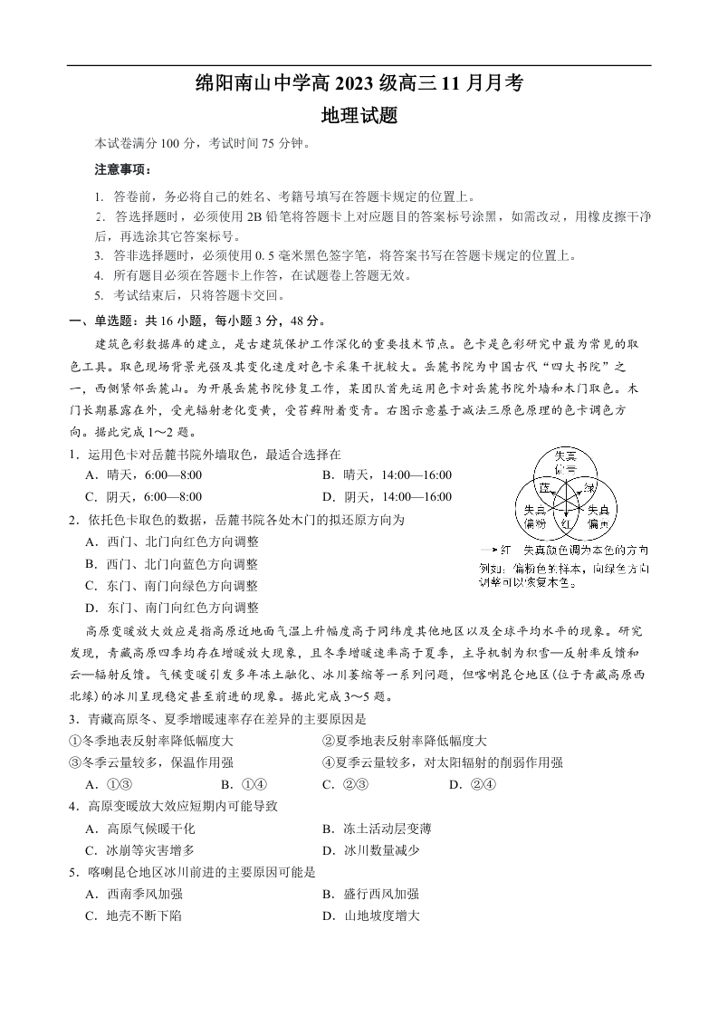 绵阳南山中学高2023级高三第四次教学质量检测 地理.docx