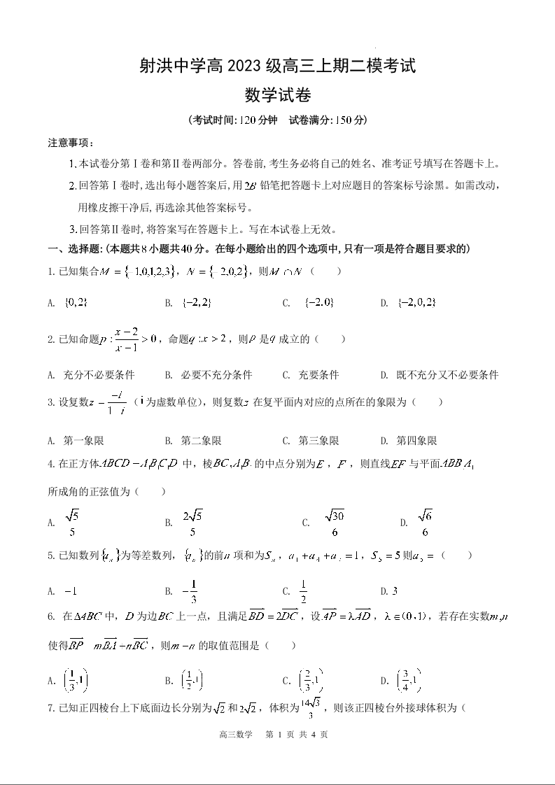 四川省射洪中学2026届高三上学期二模 数学.docx