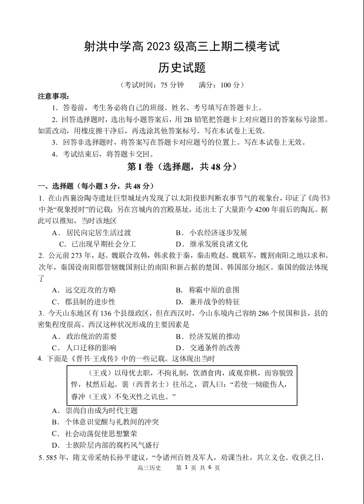 四川省射洪中学2026届高三上学期二模 历史.docx