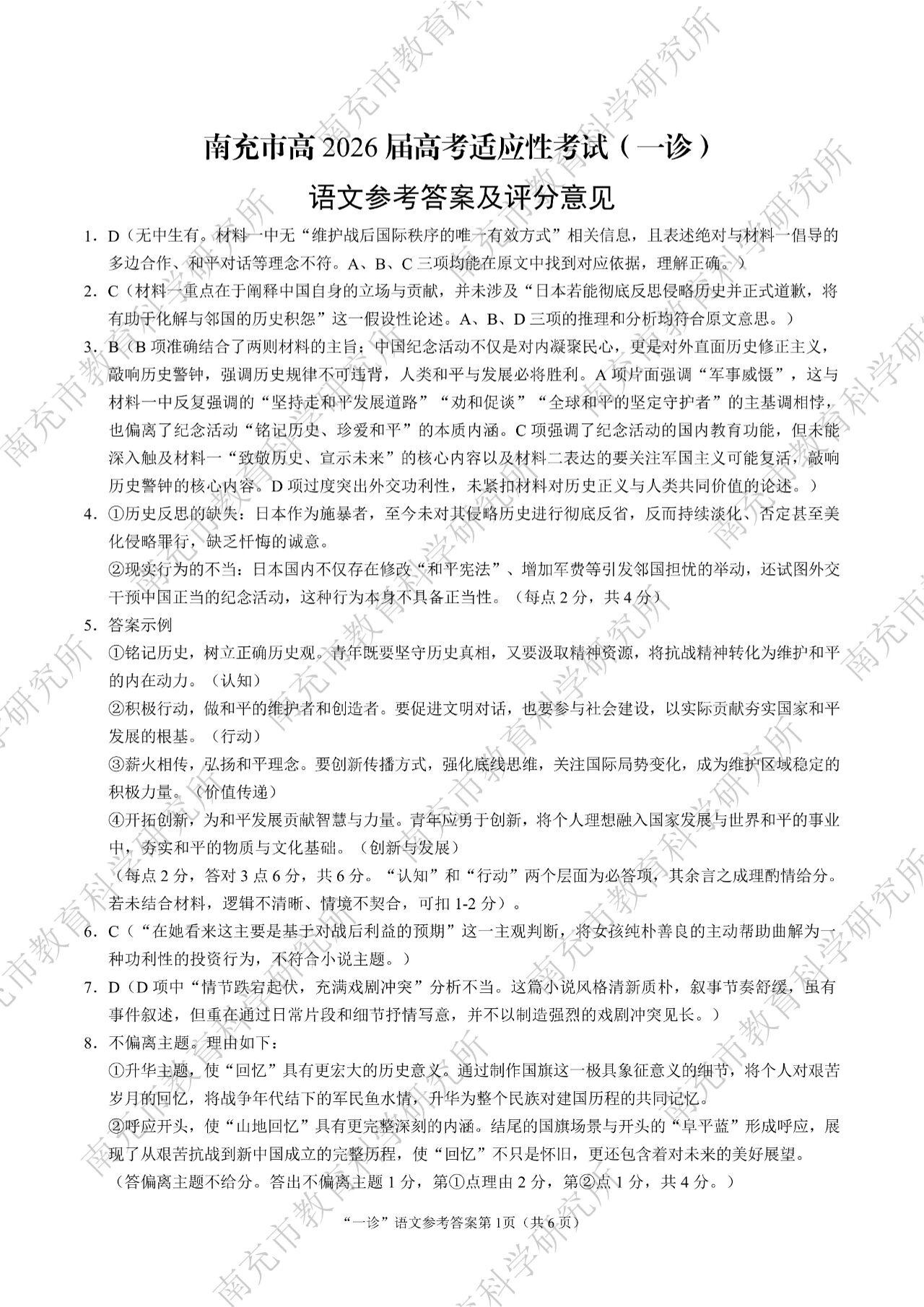 南充市高2026届高考适应性考试(一诊)语文标答.pdf
