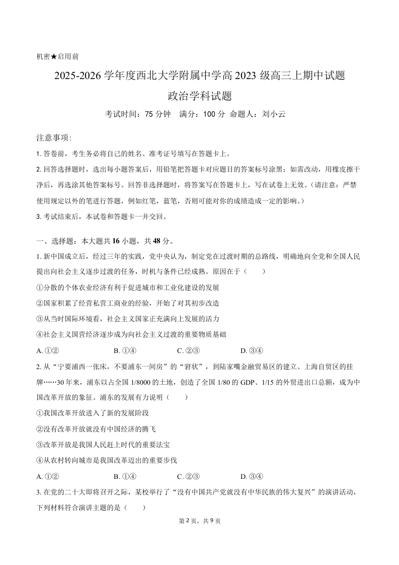 陕西省西北大学附属中学2026届高三上学期11月期中考试 政治试题(含答案).docx