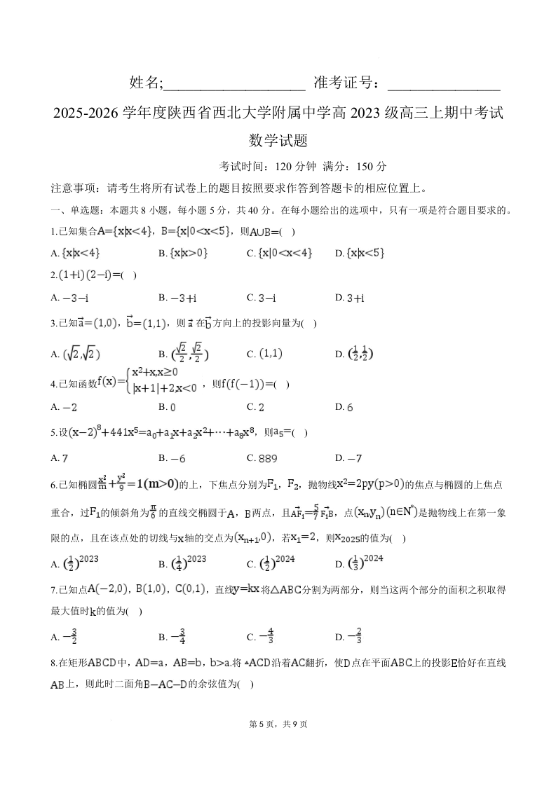 陕西省西北大学附属中学2026届高三上学期11月期中考试 数学试题(含答案).docx