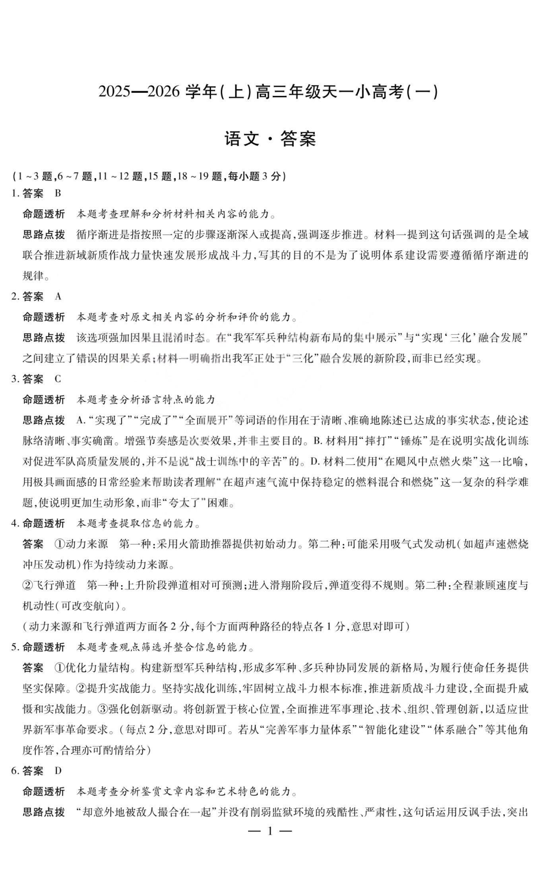 山西省天一大联考2025-2026学年(上)高三年级天一小高考(一) 语文答案.pdf