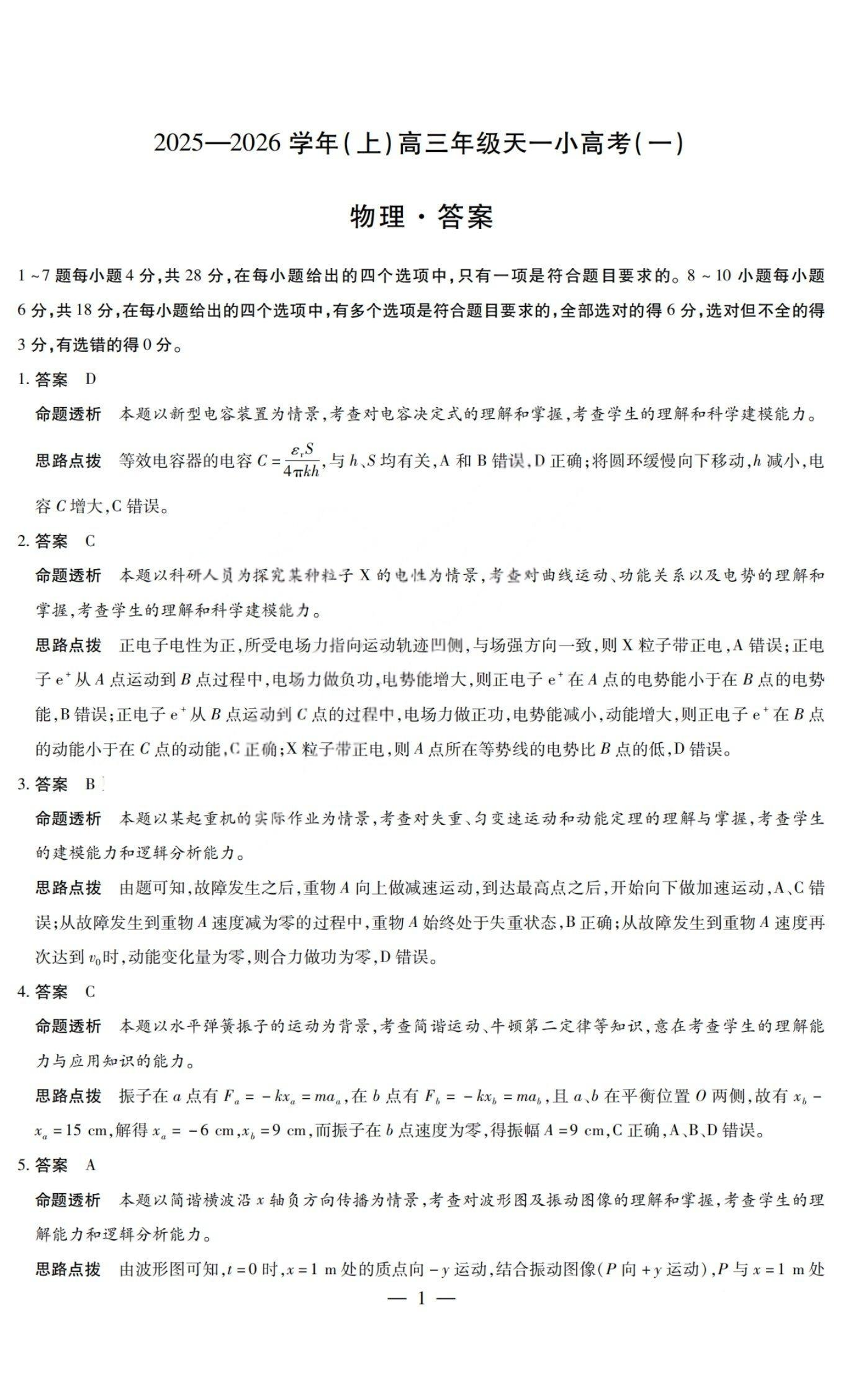 山西省天一大联考2025-2026学年(上)高三年级天一小高考(一) 物理答案.pdf
