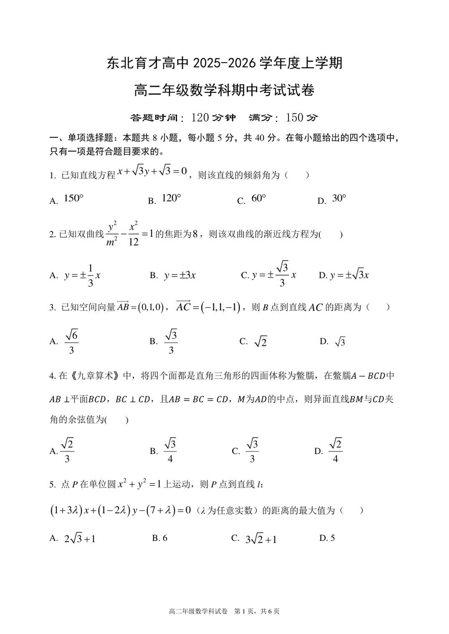 辽宁省沈阳市东北育才高中2025-2026学年上学期高二年级期中考试 数学.pdf