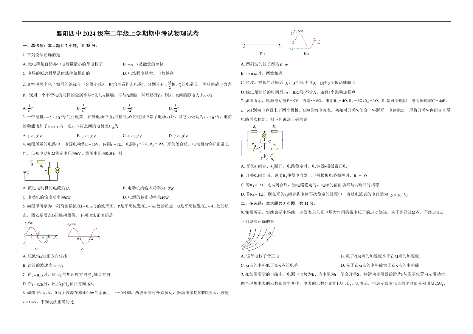 湖北省襄阳市第四中学2025-2026学年高二年级期中考试 物理试题(含答案).docx
