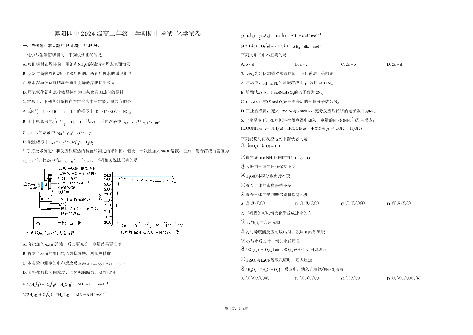 湖北省襄阳市第四中学2025-2026学年高二年级期中考试 化学试题(含答案).docx
