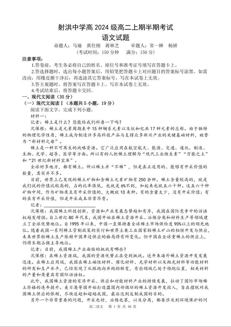 四川省遂宁市射洪中学2025-2026学年高二上学期期中考试 语文.docx