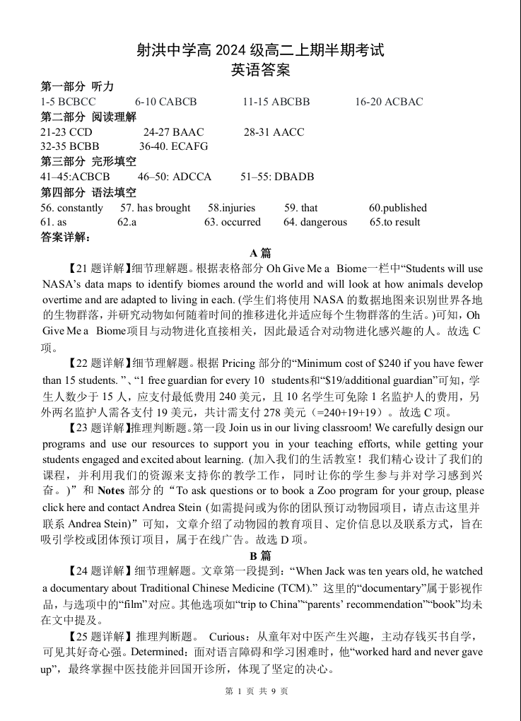 四川省遂宁市射洪中学2025-2026学年高二上学期期中考试 英语答案.docx