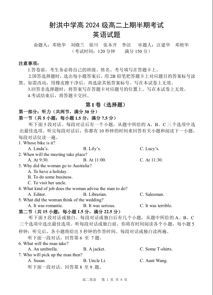 四川省遂宁市射洪中学2025-2026学年高二上学期期中考试 英语.docx