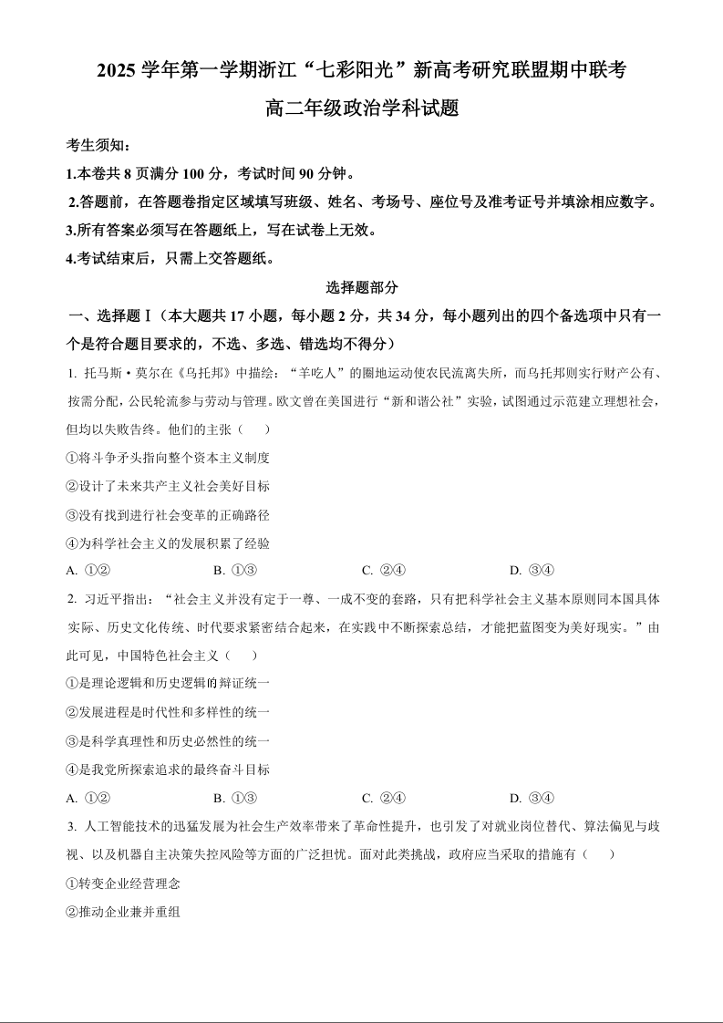 浙江省”七彩阳光“新高考研究联盟2025-2026学年高二上学期期中联考试 政治.docx